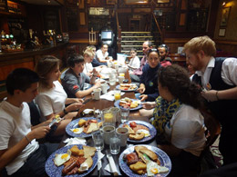 Aujourd’hui, nous nous sommes levés vers 8h du matin récupérer un filet de pêche que nous avons mis la veille au soir. Nous étions très content car nous avons remonté beaucoup de roussettes, une araignée de mer, des « bernards thermite » et des crabes que nous avons remis à l’eau. Ensuite, nous sommes allés dans un restaurant où nous avons pris un petit-déjeuner anglais avec des saucisses, des pommes paillassons, du bacon et des tartines avec du beurre. Enfin, nous avons fini par un défi « so british» que nous avons poursuivi jusqu’au soir.