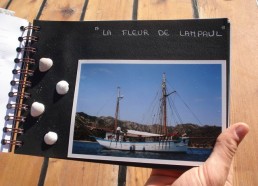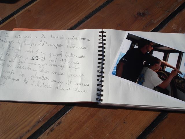Vendredi 13 juillet : Fleur de Lampaul sous voile, les Matelots écrivent leur carnet de bord. Ils arrivent sur l'île Rousse.