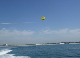Jeudi 19 juillet 2012 : Baptême de parachute ascensionnel pour tous. Le principe étant de tirer un parachute depuis un bateau, de prendre de la vitesse et donc d’envoyer le parachute dans les airs avec deux ou trois matelots harnachés, entre 60m et 80m de hauteur ! Quelques appréhensions pouvaient se lire sur les visages avant d’embarquer... mais tous avaient le sourire en débarquant ! Que d’émotions en « volant » au dessus de l’eau et en apercevant toute la côte.