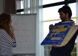 Après une courte pause ce sont les intervenants des hôpitaux qui sont venus raconter le déroulement du jeu dans leurs services de pédiatrie durant les 2 mois d’été. Jean Yves et Sébastien, créateurs des énigmes du jeu ont eu l'occasion d'expliquer le choix des énigmes parfois volontairement difficiles. Nous remercions le centre ESEAN, l’hôpital André Mignot du Chesnay Versailles, le Pavillon de La Mère et l'Enfant du CHU de Nantes ainsi que l’hôpital de St Nazaire, pour leur présence et leur participation. Le Rotary de Challans ST Jean de Monts a, très gentiment cette année, offert les prix du challenge 2013 des Matelots de la Vie et c'est donc le président du club, Monsieur Etienne LARGEAU qui a remis les cadeaux aux hôpitaux vainqueurs.