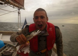 05 août 2013 : Départ de Pornic à 6h30 : dur, dur le réveil, mais tous les matelots sont volontaires et sur le pont, prêts à manœuvrer. Pas pour très longtemps car le vent et la houle ont vite décimé nos troupes ! Les matelots ont comme même réussi à assurer les quarts en se relayant et à pêcher leur premier maquereau dont ils sont très fiers !