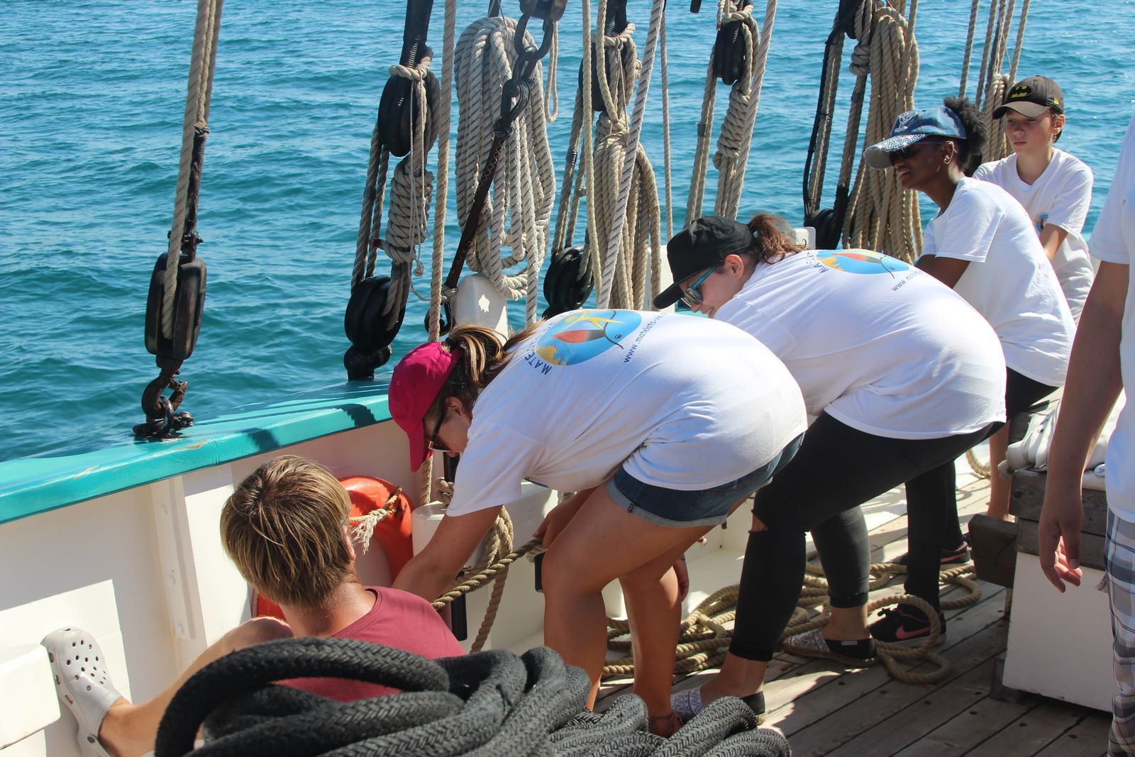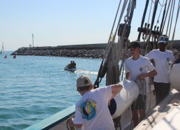 Lundi 07 août 2017 : Une belle journée au programme pour nos jeunes matelots : Aujourd’hui, c’est la première navigation. Pour l’occasion, les trois marins décident de nous faire mettre toutes les voiles dehors. À la manœuvre, tout le monde sur le pont !