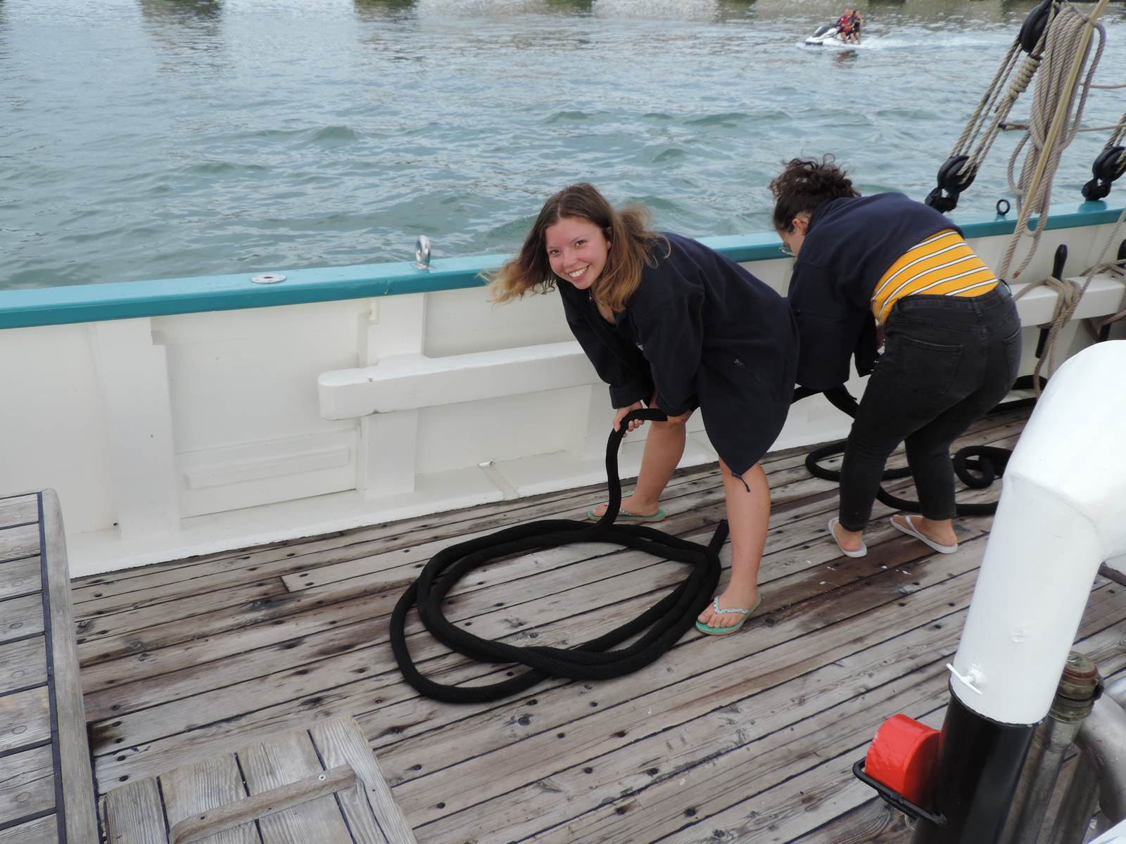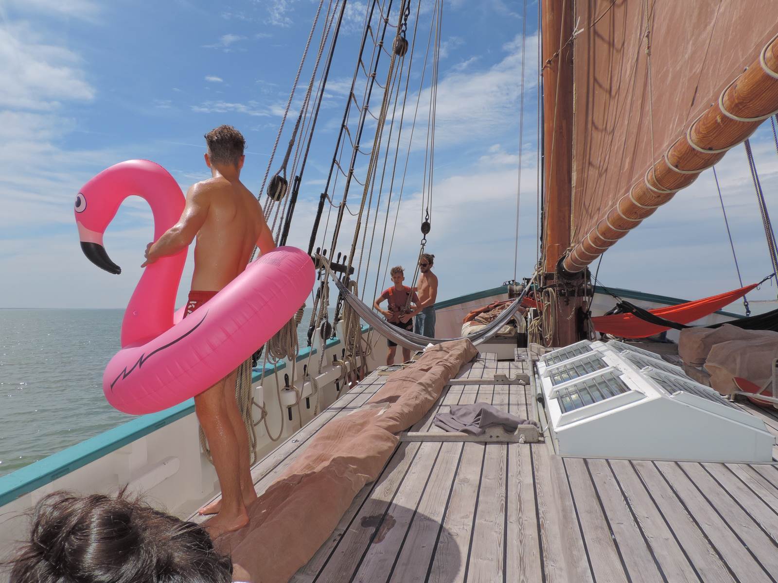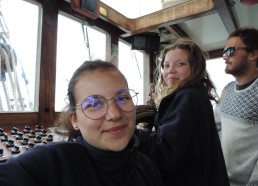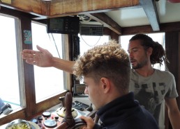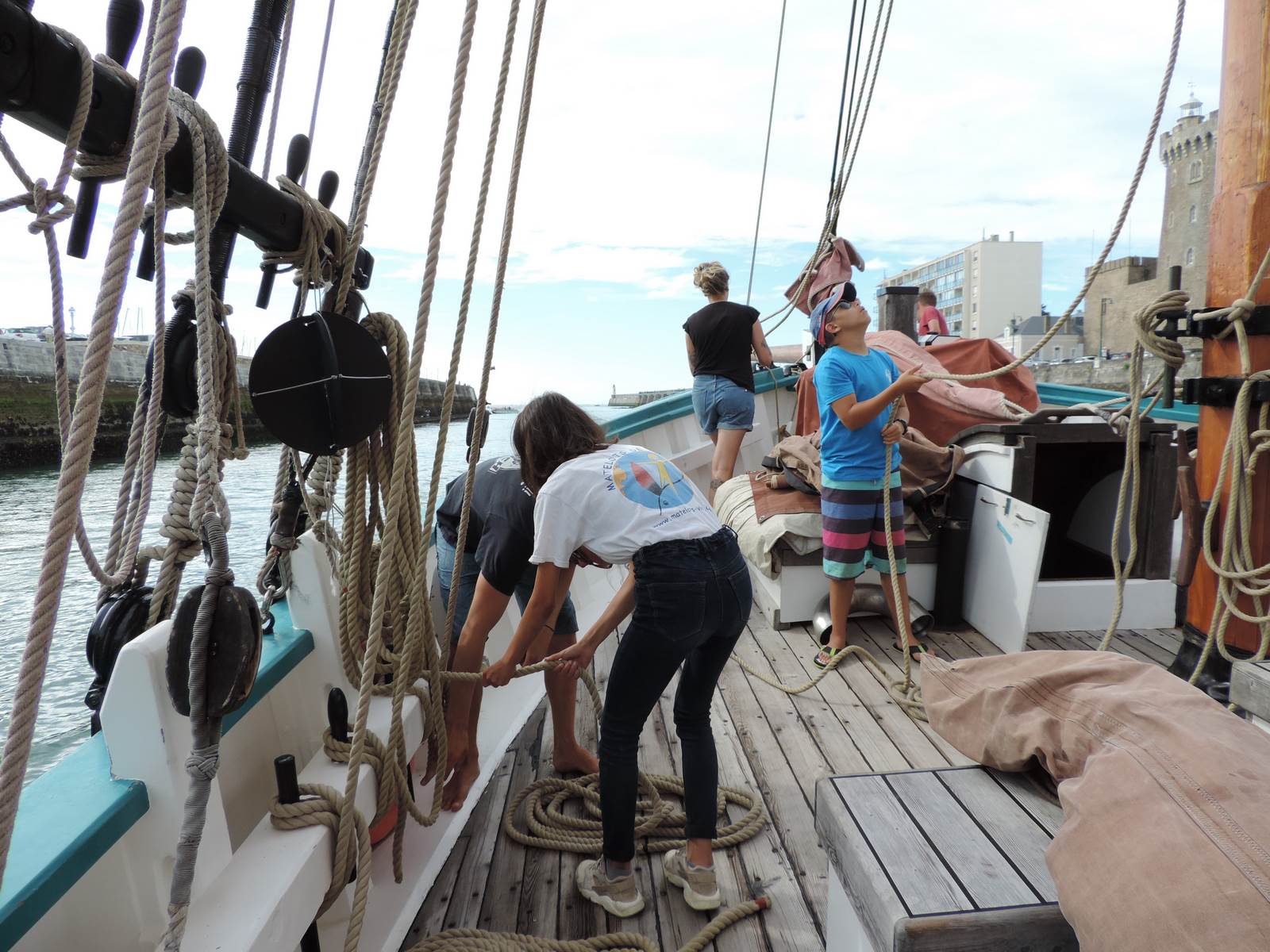 Dimanche 12 août 2018 : Nous sommes partis en navigation ce matin en direction de la Rochelle. Pas beaucoup de vent donc navigation au moteur mais un stop « mouillage baignade » et l’escalade du mât ont bien plu aux Matelots.
