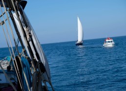 Jeudi 12 juillet 2018 : Ce matin, nous sommes partis à 8 heures du port de Saint-Quay-Portrieux ; nous avons navigué vers Bréhat avec un grand soleil mais pas de vent. Escale détente et baignade sur l'île de Bréhat. Puis cap sur Paimpol avec un accueil spectaculaire des bateaux du CNPL pensé par Jean Communier et organisé par Alain Lebreton et Jean Joubin (CNPL). Après la chorale du CNPL orchestrée par Christian GABRIEL, les matelots se jettent à l'eau et osent se mélanger aux chœurs pour un Santiano enthousiaste. Les douches et au lit !