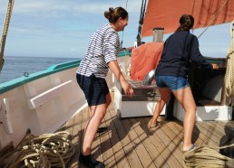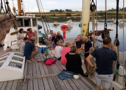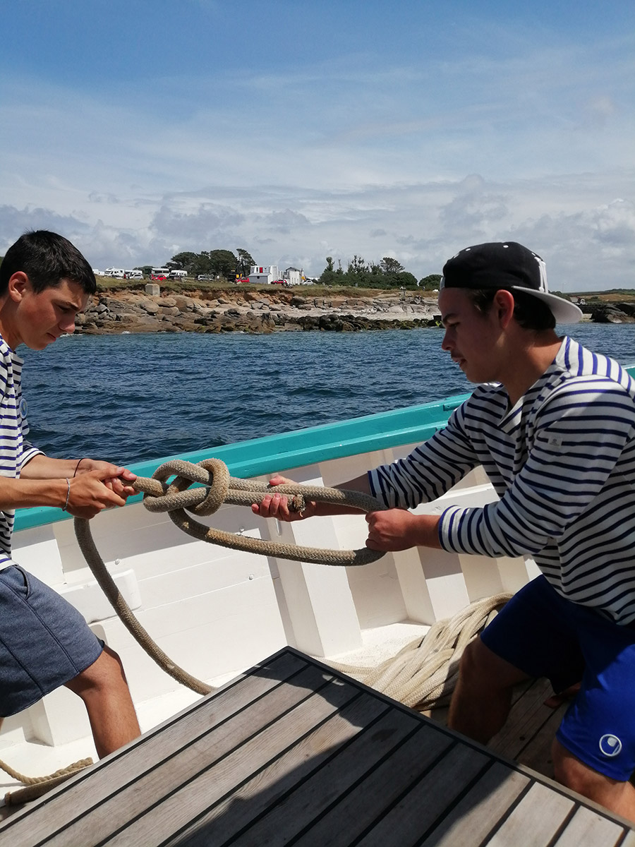 Vendredi 26 juillet 2019 : Navigation houleuse vers l’Aber Ildut, avec une belle surprise, la visite des dauphins. On surf la vague pour suivre les mouvements du bateau.