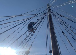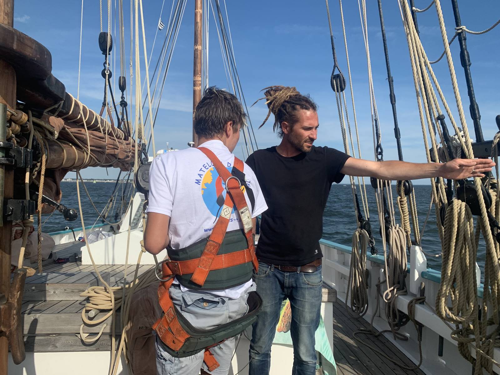 Vendredi 20 août 2021 : Pour leur dernier jour au mouillage, les matelots ont goûté une dernière fois à la mer. Ils ont ensuite entrepris une ascension sur le mât de la Fleur. Après l’effort, le réconfort : ils ont préparé et mangé des crêpes ! Pour finir la journée, ils ont passé la nuit à la belle étoile.