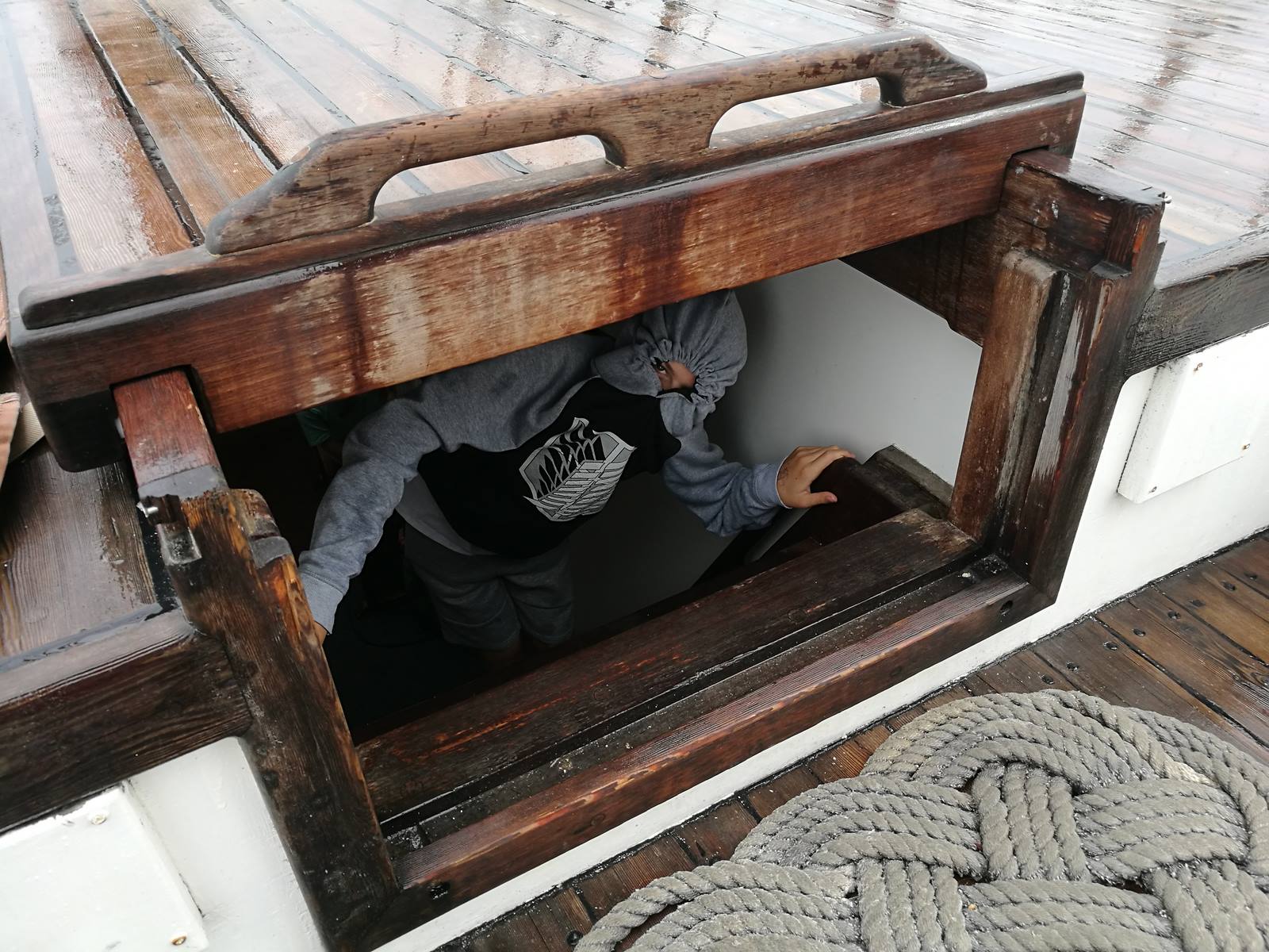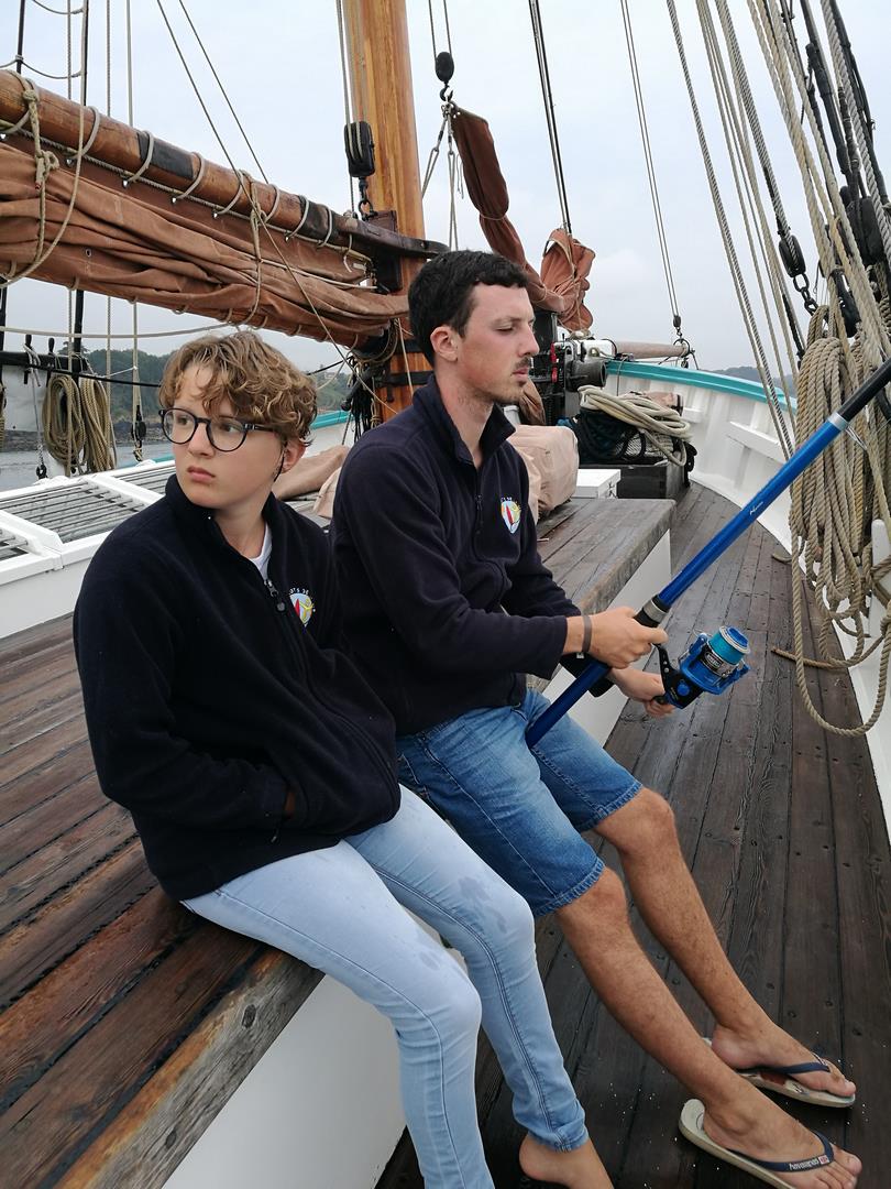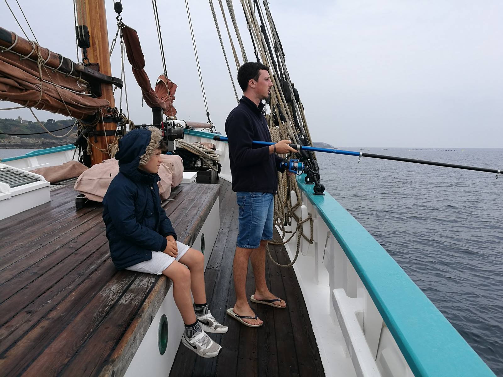 Dimanche 14 août 2022 : Première navigation sous la pluie pour les matelots ! Ils quittent Lorient pour aller sur l'île de Groix. L'après-midi est bercé de jeux en intérieur avant une baignade dans le Port Lay.