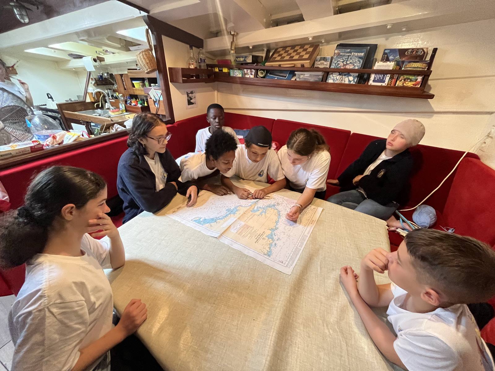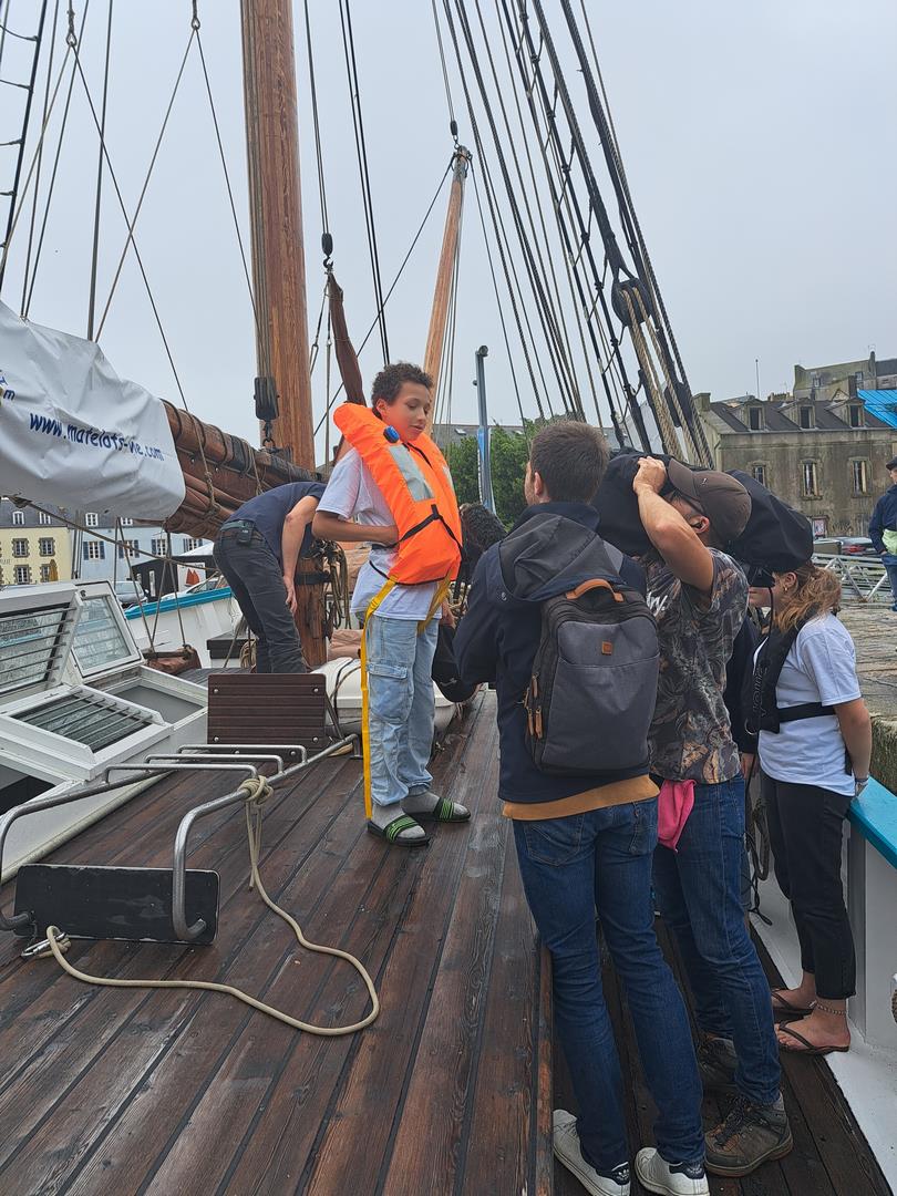 Lundi 31 juillet 2023 - Jour 1 : Après une 1ère nuit assez courte (merci l'excitation de la première nuit), nos matelots ont pu commencer leur rôle d'ambassadeur. Ils ont eu la chance de rencontrer Amandine & Oesteban qui leur ont expliqué leur rôle au sein de l'association Ystopia. Après une récolte d'eau à l'aide d'un filet servant de filtre et d'une bouteille, ils ont utilisé des microscopes pour observer de plus près la composition de l'eau et, par conséquent, la biodiversité qui nous entoure. Ils ont pu donc se rendre compte de la multitude de planctons présents dans l'eau ; mais aussi, malheureusement, de plastiques microscopiques.